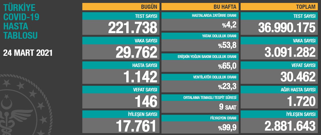 Türkiye tarafında corona virüsü vaka sayısı 3,091,282 kişiye çıkarken, ölü sayısı 30,462 kişiye ulaşmıştır. Toplam test sayısı 36,990,175 kişiye ulaşırken, günlük hasta sayısı (1146) 1000 kişi üzerinde sürmektedir.