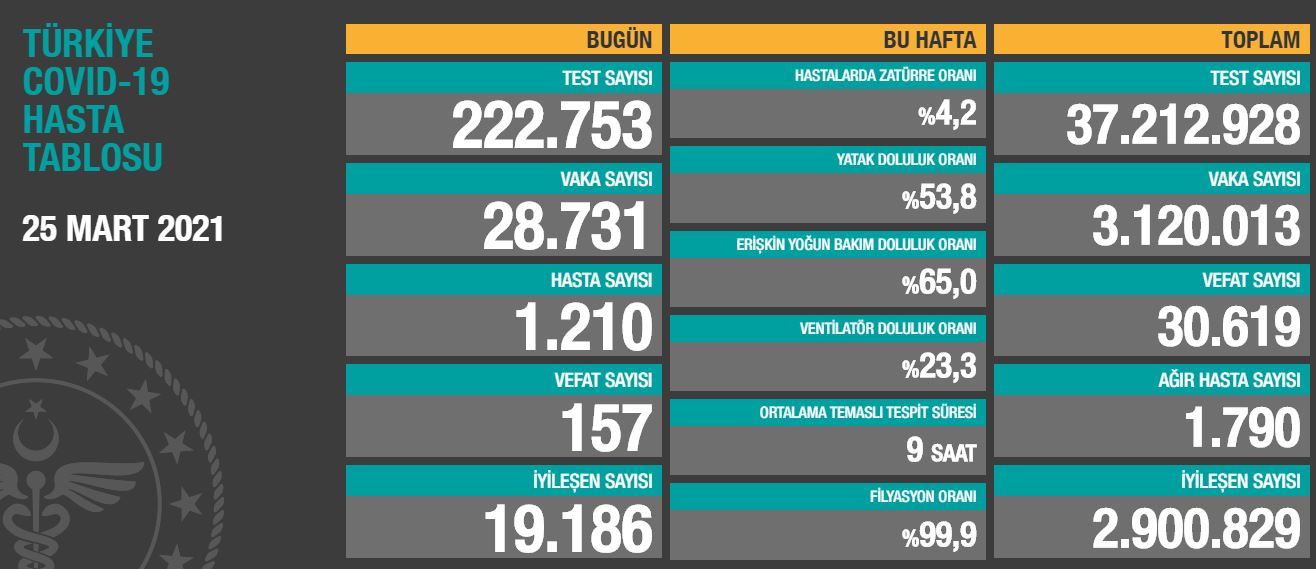 Türkiye tarafında corona virüsü vaka sayısı 3,120,013 kişiye çıkarken, ölü sayısı 30,619 kişiye ulaşmıştır. Toplam test sayısı 37,212,928 kişiye ulaşırken, günlük hasta sayısı (1146) 1000 kişi üzerinde sürmektedir.